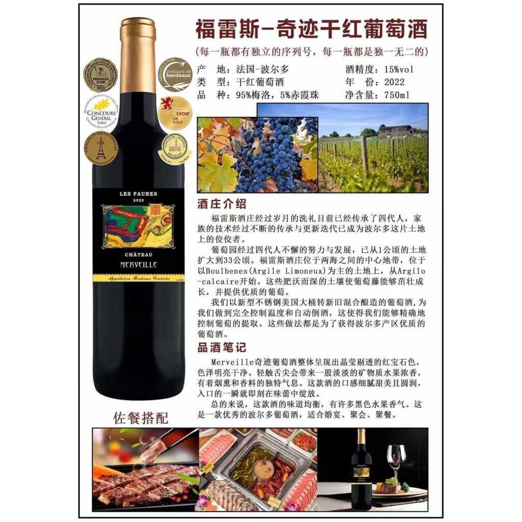 酒莊介紹:Chateau Les Faures (福雷斯酒莊)經過歲月的洗禮,目前已經傳承到第四代,家族的技術經過不斷的傳承及更新迭代已經成為了Bourdeaux(波爾多)這片土地上的佼佼者。葡萄園經過四代人不斷地發展與努力,已經從1公頃的土地擴大到33公頃。弗雷斯酒莊位於兩海之間到土地上,從Argilo-calcaire開始,這片土地肥沃而深的突然使葡萄藤能夠茁壯成長,並提供優質的葡萄。